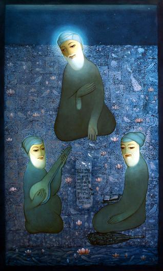 But for sikhchic.com, this jewel would have remained hidden for many of us. A lotus from Bassian indeed, a nondescript village near Jagraon. It was once again the mother who subliminally imparted those qualities with her milk, that made Harjinder Singh what he is today. His mother was a kirtania and also a hidden artist in her own right. She improvised the brushes by using cotton swabs around twigs. Reminds me of the famous sculptor known for exquisite statues of horses. When asked how he did that, his answer was simple. "I chip away what doesn't look like a horse". Harjinder Singh's paintings have a meditative quality - a certain quietude that probably comes when he spent some years in a monastery. But, more so he was born into a deeply religious family. The two Baara(n)h Maah's by Guru Nanak and Guru Arjan have no equal and are enough to lift any ordinary man to immeasurable heights and compelled Harjinder Singh to paint some 700 paintings.