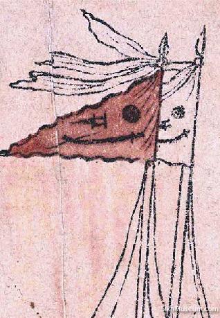 Images: Above - A flag depicted in an illustrated manuscript (B40), 1733. Below, 1st from bottom - late 19th-century military turban badge. 2nd - 19th-C woodcut shows Akal Takht's Miri-Piri flags. 3rd - late 19C print of Gurus shows a version of khanda.