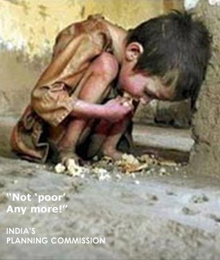 Indian bureaucrats now claim that an Indian above a MONTHLY consumption of Rs. 859.6 (less than $18) in urban and Rs. 672.8 (less than $14) in rural areas is not considered poor, as per the new miracle formula.