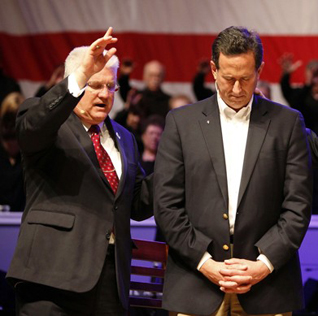 Above: Christian Pastor Dennis Terry prays with Rick Santorum after asking non-Christians to "GET OUT" of America.