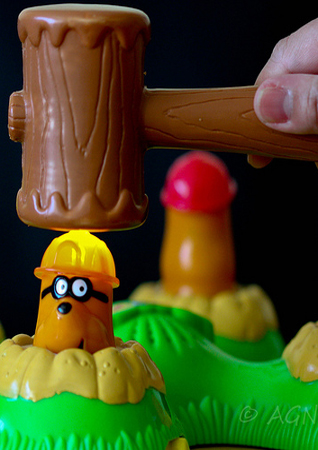 EDITOR'S NOTE: Whac-a-Mole is an arcade game popular at country fairs in North America. A typical Whac-a-Mole machine consists of a large, waist-level cabinet with five holes in its top and a large, soft, black mallet. Each hole contains a single plastic mole and the machinery necessary to move it up and down. Once the game starts, the moles will begin to pop up from their holes at random. The object of the game is to force the individual moles back into their holes by hitting them directly on the head with the mallet, thereby adding to the player's score. The more quickly this is done the higher the final score will be. [Wikipedia]
