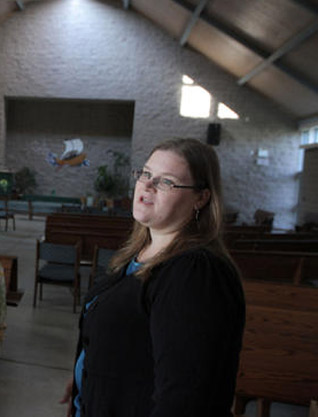 On Saturdays, those empty pews are filled by Temple Shalom congregants and the west-facing Christian portion of the sanctuary, where a New Testament-inspired image of a boat with billowing sails decorates the wall behind Savage’s pulpit, is silent.