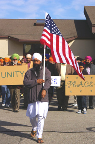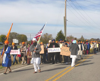 Carrying the American and Sikh flags, signs of peace, unity, and love, the 200-strong participants walked from Acton United Methodist Church to the Gurdwara down the road, singing, reciting, and shouting jakaras (exuberant Sikh acclamations) along the half-mile route.