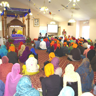 Following Punjabi tea and snacks, the heads of various organizations that sponsored the Walk were introduced, there was a brief period of question-and-answer, and then the entire group was led into the gurdwara sanctuary where Sikh hymns were being sung by visiting raagis (Sikh spiritual minstrels).