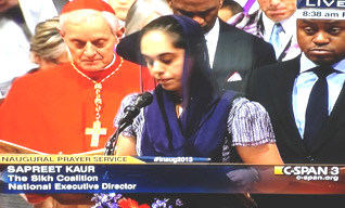 1 At the Presidential Inaugural Prayer Service at the Washington National Cathedral -- attended by the President, the First Lady, the Vice-President, et al -- Sikh-American Sapreet Kaur (Executive Director, Sikh Coalition) was asked to offer a prayer. She did, and was joined by members of the other faiths that, collectively, so enrich the country.