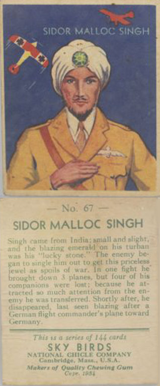 Above: Two sides of a trading card for kids from 1934, inspired by the WW1 exploits of air ace Malik Hardit Singh.