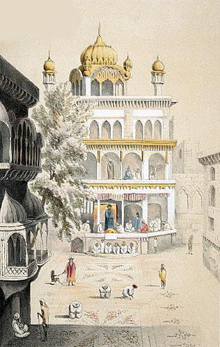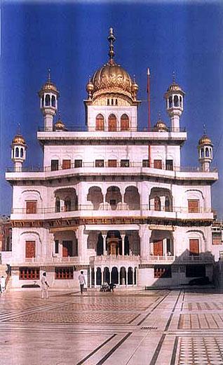 Above: 1984 - Indira Gandhi's handiwork. Below: first from bottom - The pre-1984 Akal Takht in a 19th Century sketch. Second from below - The new Akal Takht, post 1984.
