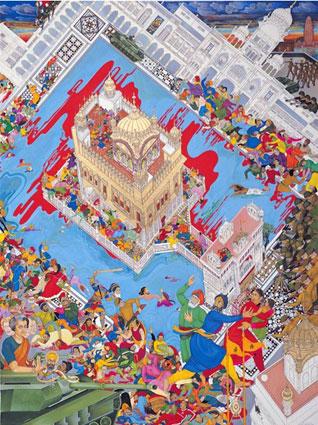 However, the painting shows that "the main casualties of the attack were in fact the thousands of pilgrims who had come to pay homage on one of the most important religious days in the Sikh calendar".