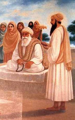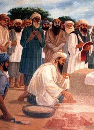 Images: Details from an artist's rendition. Above - Saa-ee(n) Mian Mir lays the foundation of the Harmandar Sahib. Below, Baba Buddha (seated) and Guru Arjan look on.
