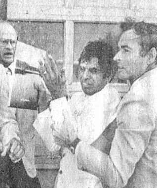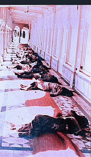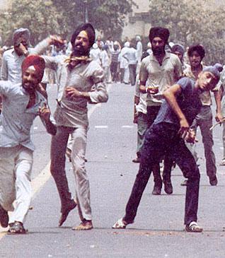 Above: Innocent victims of the military assault seen lined up along the parikarma of The Darbar Sahib. Below, 1st from bottom - angry young men vent their anger in New Delhi. 2nd: Indian ambassador is pelted with eggs in Winnipeg, Canada.
