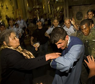 Police rushed into one of Christianity's holiest churches Sunday, November 9, 2008, and arrested two clergymen after an argument between monks erupted into a brawl next to the site of Jesus' tomb in Jerusalem.