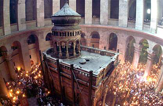 Above: photo of the brawl, courtesy - The Associated Press. Images below: The Church of the Holy Sepulchre, from the outside and the interior.