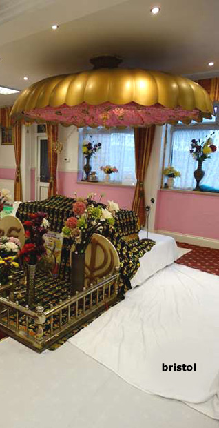 In Bristol, at the Gurdwara on Chelsea Road, there are few clues within the building (once a church, then a leather goods factory) as to its original function. Members of the community working locally as engineers offered their skills when the restructuring of the building was carried out. The palki sahib itself was designed by a member of the community. The fibreglass canopy is designed to suspend effortlessly from the ceiling.