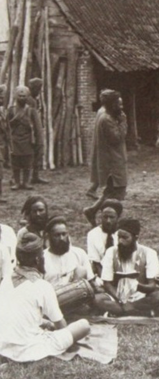 Above: Lance-Naik Ishar Singh (France, WWI). Below, first from bottom: Sikh soldiers singing kirtan outside their billets in France during the First World War . Second from bottom: detail from a sketch of the Darbar Sahib, c 1850s.