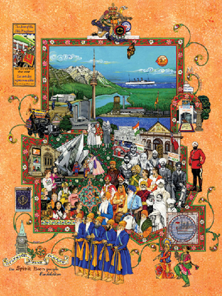 Read from top to bottom, the painting moves from the scenic West coast of Canada to the urban metropolis of Toronto, and from early migrants to contemporary Canadian society. It features Sikh contributions in the early twentieth century to the infrastructure of Canada (Canadian Pacific Railway and Liner, Mayo and Doman Lumber Companies), their struggles and triumphs to establish communities (the Komagata Maru Incident, establishing gurdwaras, and installation of the first Guru Granth Sahib in Vancouver), and their participation in key positions in government, business, media, and arts (Federal and provincial Parliaments in Ottawa, the first turbaned officer of the RCMP, OMNI TV, and dhol player).