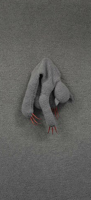The series ‘Camouflage', 2012, is in many ways about ‘fitting in’. In each of the three canvases, a clawed figure was made from the same material as the background, there is a sense of futility and it’s evident that the figures are hopelessly failing to blend in to the surface.