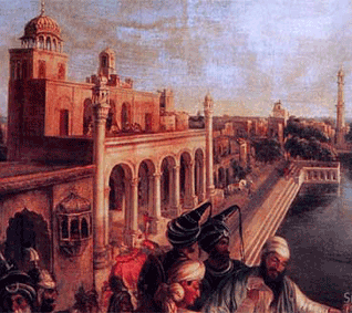 The painting by Viennese artist, August Schoefft, of Maharaja Ranjit Singh sitting in devotion on a balcony overlooking the Darbar Sahib complex at Amritsar is both stunning and full of details.