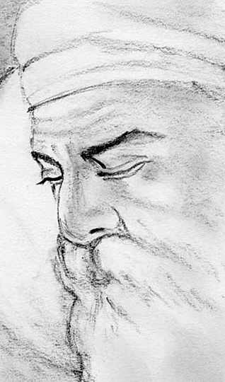 Above: A sketch of Guru Nanak, by Bobby Sandhu. Below - third from bottom: Guru Nanak and Mardana arrive. Second from bottom: The siddhs receive the visitors. First from bottom: In dialogue.