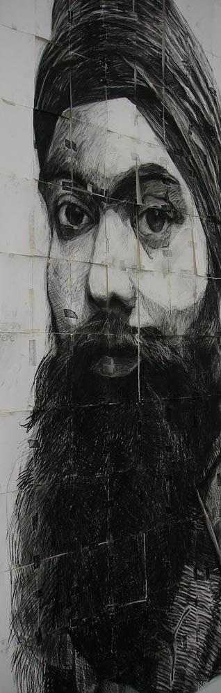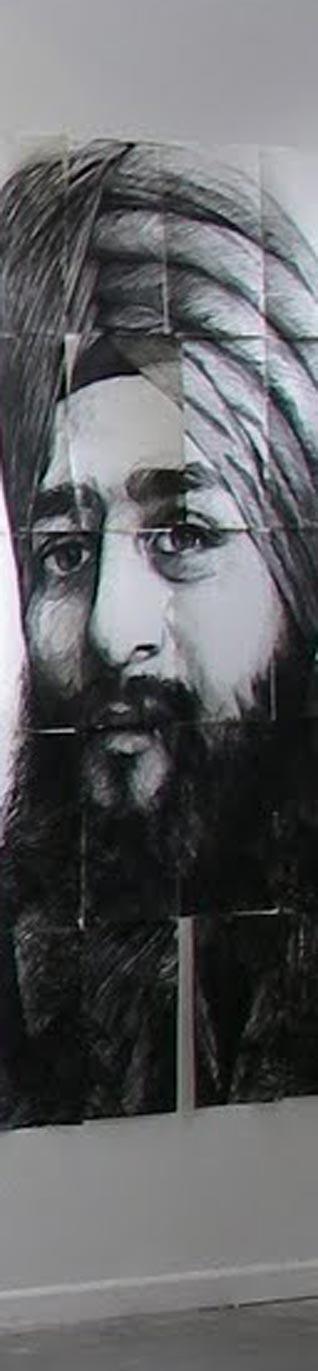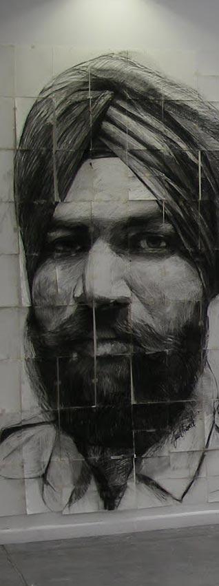 His protagonists are Sikhs, whose portraits have been sketched in charcoal on paper. Reflecting a sense of immediacy, the life-size mixed media work, with masking tape, projects the vulnerability of these youths, the challenges faced and the obstacles that they need to overcome.