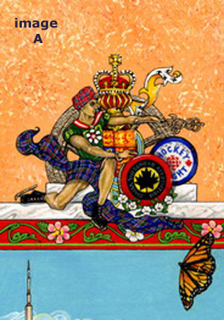 At the top of the painting is a crest with references to the first turbaned Sikh to play for the Canadian football league, the official maple leaf tartan of Canada wrapped into a turban, and CBC Sport's broadcast of 'Hockey Night in Canada' with Punjabi commentary. The migratory monarch butterfly, the National insect of Canada, symbolizes both Sikh migration and official recognition in Canada.