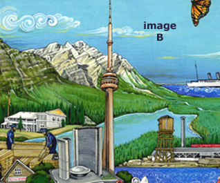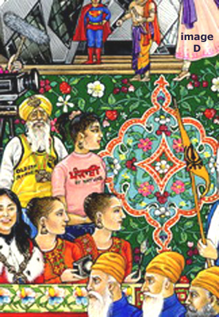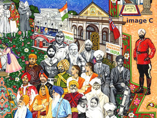 The painting moves from the scenic West coast of Canada to the urban metropolis of Toronto and from early migrants to contemporary Canadian society. Decorative details provide a symbolic dimension, such as the combined paisley and maple leaf motif to represent the Sikh-Canadian identity.