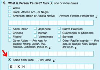 Please note that in the question "What is person's race?", you can mark one or MORE boxes. I know a 'white' Sikh who is checking two boxes: one for 'white' and the other "some other race" by writing-in SIKH. If you are a Sikh of say Indian backgroud, you can again check two boxes - Asian Indian and write-in some other race as SIKH. I know of a couple of other situations: One where the person is Sikh with father born in India and mother being 'white'. That person is checking three boxes - Asian Indian, White and "some other race" as SIKH. Another Sikh born in Japan but living in U.S.A., can check two boxes - Japanese, and SIKH under "some other race". All four examples have one thing in common. They are writing SIKH under "Some Other Race". This way, Sikhs are being counted. Gradually, Sikhs are getting more diversified but remaining as a Sikh of "Sikh people" or Sikh Nation as a common identity. [EDITOR: Those who check mutiple boxes are counted as mixed race. It is okay to do that if you believe your count is important towards that particular race as long as you also check 'SOME OTHER RACE' and write-in the word 'SIKH'.]