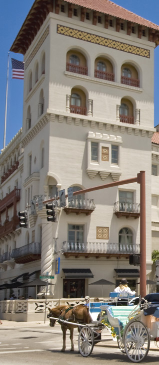 Henry Flagler was responsible for some of the best creations. He built two hotels in 1888. The first, named the Ponce de Leon, stands in full splendour even today -- an expanse of buildings punctuated by towers, turrets and arcades. It now operates, however, as a liberal arts institution, Flagler College, and dominates the historic district of St Augustine.