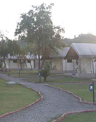 Photography: by Aseem Choudhari. Images below: first from bottom - View of the resort from a hill-top kikar tree. Second from bottom: the tents. Third from bottom: a panoramic view of the property. Above: Looking out from one of the cottages.