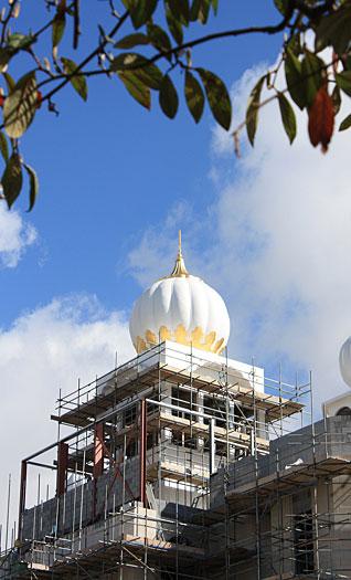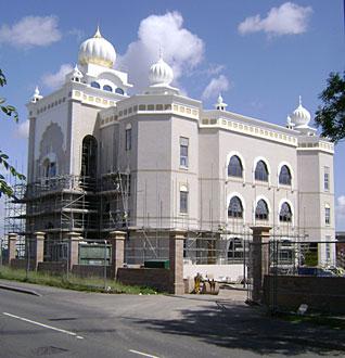 In the airless langar (dining hall) of the town's existing temple - a disused plastics factory with asbestos roofing, dark corridors and bland offices - the project team sidesteps invitations to respond to negative attitudes about its new home.
