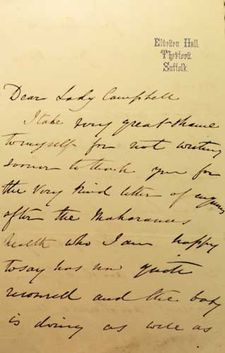 I’m still not clear who Lady Campbell is, the person to whom the letter is addressed. Considering that Duleep and the Prince of Wales had, for much of their youth, been close friends, and the nature of the sentiments expressed in the letter, it is possible that she is someone in either his household or in that of Queen Victoria.