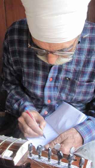 Characteristically, his eyes twinkle and he snorts with laughter as he observes that when several of the Harmandar Sahib raagis sing, the poor lads playing the accompanying dilruba or taus are often seated obscurely to the side with no microphones before their instruments!