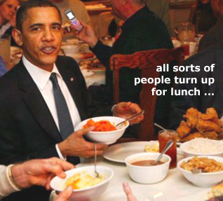 We’re in a huge dining room -- just like yours and mine, only somewhat bigger. There are four huge dining tables, with a dozen chairs around each. In the far end, a door and window suggest a kitchen beyond. There is considerable commotion in there, albeit an organized one. Figures in white are moving in unison.