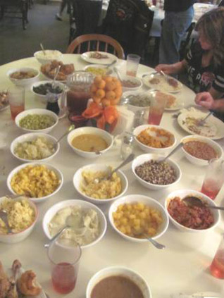 A flotilla of waitresses appear. And in two minutes flat they cover the expanse of our table-top with dishes galore. I count 17 different ones. The only ones I can recall now are: Fried Chicken. Cabbage. Snap beans. Candied yams. White rice. Beef stew. Sausage. Pickled beets. Black-eyed peas. Okra. Baked ham. Tomatoes. Mashed potatoes. Red rice. Gravy. Squash. Rutabaga. Peppers.
