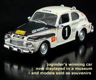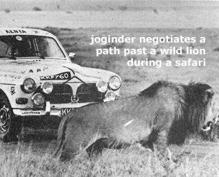This takes me straight back to my school days in Nairobi when Easter holidays were synonymous with the Safari Rally. On the first day of the rally all my friends and I used to make a beeline to the City Hall to see the cars being flagged off and then remained glued to the radio listening out for Joginder's name. On the last day it was just sheer good luck if amongst the huge crowds, if we managed to get just a glimpse of the great man himself. Such was the excitement in the air that the whole country used to come to a standstill. One year when Joginder came first in the rally, as soon as he had been officially acknowledged the winner and the customary bottles of champagne had been cracked open in celebration, he headed straight to Sri Guru Singh Sabha Gurdwara on Racecourse Road, where Sikhs had gathered to welcome him with sounds of dholki and chhenney, singing shabads. I was in that mini-procession from the outside gates to the Darbar Hall to do ardaas and mathha tekna in shukrana. In those days every Sikh was Joginder Singh and every Sikh was a rally driver, they commanded a great deal of respect due to one man's passion.