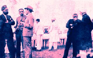 Above: Sardar Sobha Singh (far left) talks to the architect, F.B. Blomfield. On the right, Sardar Teja Singh Malik and Sardar Narain Singh.