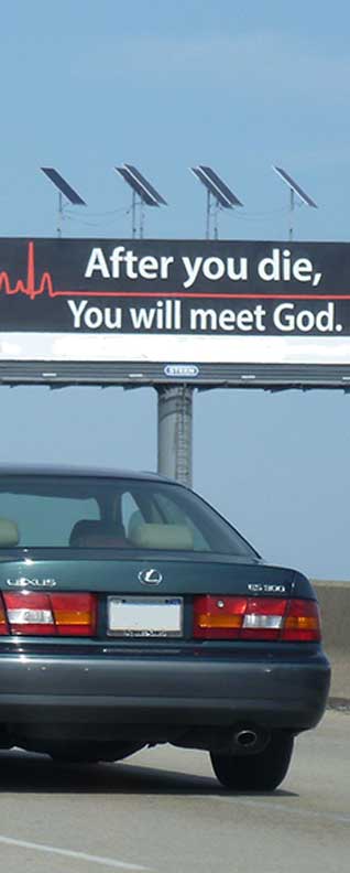 The moral concern is subtler in that for every billboard with a Bible quote, there are probably five advertising liquor stores, massage parlors, and pornography supermarkets.