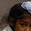 His eyes are round and dark. He is a small boy, skinny, with a bulge for his tummy. He is clinging to his mother's side.