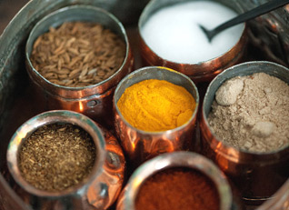 Unlatch the domed lid and you find a shallow tray with a long, dainty spoon for measuring. Below are tucked six canisters of spices, five of them -- loon (salt), jeera (cumin), dhania (coriander), laal mirch (red chilli) and amchoor (mango powder) -- arranged like petals around huldi (turmeric) at the center.