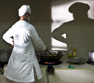 Mr. Singh works alone in the hot space preparing a five-dish meal for sixty, yet his kurta and pajami - white, as his position requires - show no trace of perspiration, no splotches of stray curry.