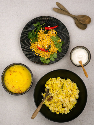 Above: Clockwise from top: chana daal sundal; yogurt; kichri with massour daal; buttery moong daal. Bottom: Clockwise from top right: whole red lentils, whole mung beans, urad daal, moong daal, a rice and daal mixture, massour daal. Photos: Karsten Moran.