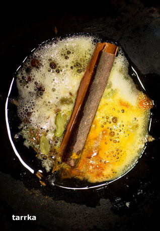 At this point, the daal is edible but bland. It’s time to amp up the taste with a technique all Punjabi / Indian cooks know: sizzle a handful of spices in hot ghee to make a tarrka. (Compare this to the western technique of adding garlic and parsley to a skillet full of sautéed green beans or potatoes for a final blast of seasoning. Not exactly the same, but you get the idea.)