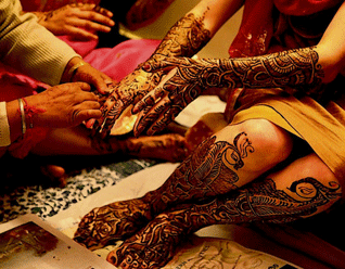 Henna painting was another key stage of the ceremony. "It's done on the second day and traditionally the entire leg is painted. It took two guys three hours to paint my legs and hands and they inscribe the initials of the groom somewhere in the patterns and the groom has to find them. As the henna sets and dries, there is singing and dancing and food. Before the marriage ceremony, the henna is washed off with milk and rose petals and you have to wear special bangles for 40 days and 40 nights. So you are really in character and it's a ceremonial dress."