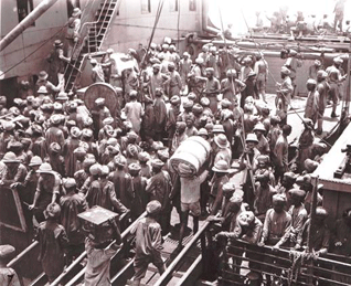 Images: above - Sikhs in battle in Sicily, WWII, 1943. Below - 1st from bottom - WWI battle scene depicted in a painting. 2nd - WWI Sikh soldiers embark in Bombay for Europe. 3rd - Maharaja Bhupinder Singh of Patiala inspects troops, Belgium, April 1915.
