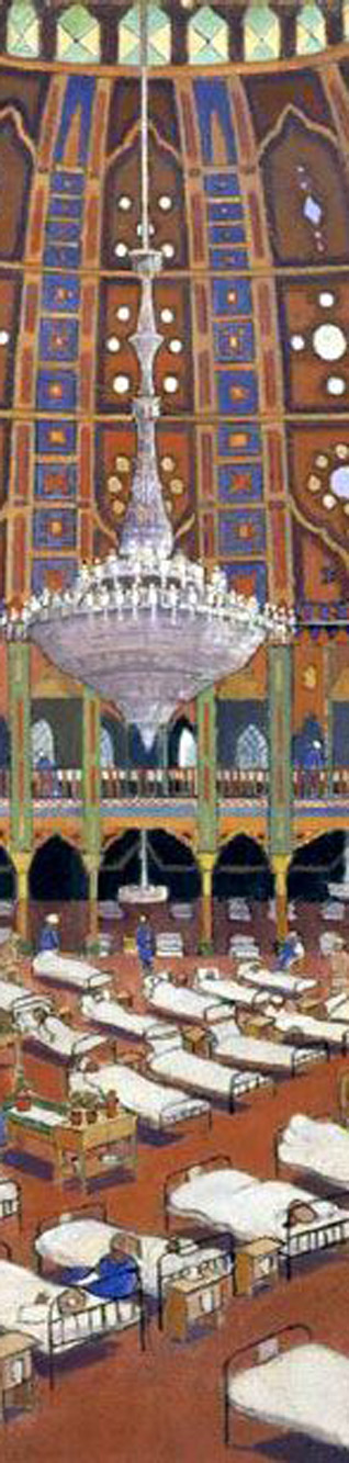The Royal Pavilion is unlike any other castle in England. Built for the Prince Regent, later King George IV, in stages between 1787 and 1823, it appears to have been designed as if for a children’s fairytale book. With palm-tree columns, Chinese dragons, exotic looking eastern minarets and domes it is hard to believe that it is real at all. A stunning work of architectural fancy that was rapidly converted into a hospital for wounded Sikh and Indian soldiers in late 1914.