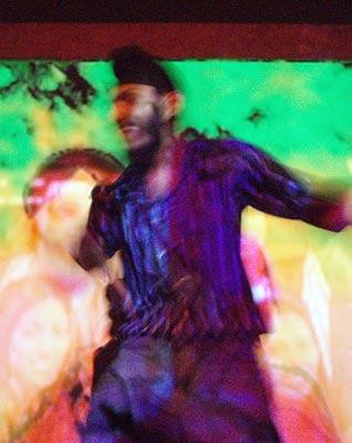 An unlikely-looking group of performers emerge from the downstairs dressing room onto the club floor. Escorted by bouncers, they head towards the stage. The guys wear puggris, kurtas and lunghis. The girls sport salwar-kameezes and dupattaas.
