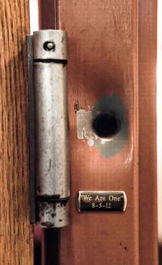 At the Gurdwara in Oak Creek, Wisconsin, there is a bullet hole in a metal doorpost to the sanctuary. The Sikh community has decided not to repair the doorpost but instead to leave the hole as a reminder.