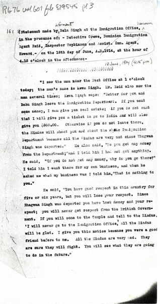 Statement made by Bela Singh at the Immigration Office, in the presence of: Detective Crewe, Dominion Immigration Agent Reid, Inspector Hopkinson and Assist. Imm. Agent, Howard, - on the 18th day of June, A.D.1914, at the hour of 4.15 o'clock in the afternoon: