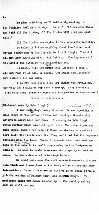 A few weeks earlier, while browsing on komagatamarujourney.ca, I came across an amazing document which I would like to share with you all. It is a primary source from June 18, 1914; a statement made by Bela Singh and Babu Singh to Inspector William C. Hopkinson in regards to a recent meeting they had had with Mewa Singh. [Please see images on right.]