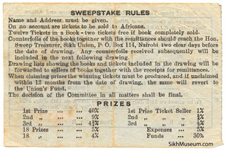 The Sikh Union would conduct lottery draws to raise money and the ticket was for a draw in July 1934. On the front of the ticket is a prominent Khanda logo for the Sikh Union and a listing of all the committee members and the fact that this lottery was authorized by the Police. On the back were the rules and regulations for the draw.