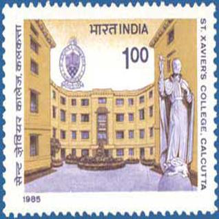 Above: The Prime Minister, with West Bengal's Chief Minister, at St. Xavier's. Below, 1st from bottom: The painting gifted to the P.M. on the occasion. 2nd: the postage stamp issued to commemorate St.. Xavier's 125 th anniversary in 1985.